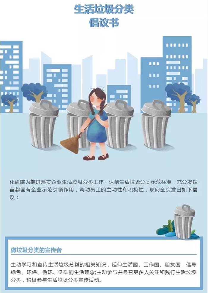 化研院為充分發揮首都國有企業在“推進落實企業生活垃圾分類工作,達到生活垃圾分類示范標準”工作中示范引領作用,向全院干部職工發出了做好垃圾分類的倡議書。